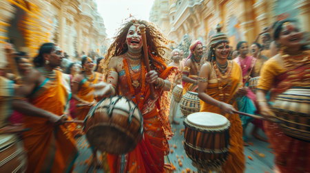 Exuberant Celebration of Indian Festival with Performers in Ornate Costumes and Makeup Dancing in a Street Parade.