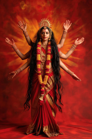 Indian woman wearing a red sari and gold accessories posing as the Hindu goddess Durga, standing in front of a red background