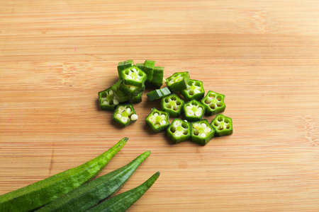 Okra or Lady's finger or Bhindi fresh green vegetable arranged on a cutting board with some sliced rings on wooden textured background, selective focus.