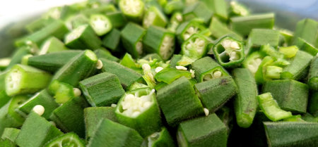 Freshly chopped okra, ladyfinger or bhindi in a stainless steel plate. Ideal for use in cooking blogs, food preparation concepts, or kitchen stock imagery