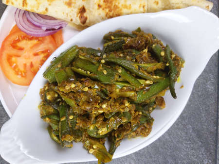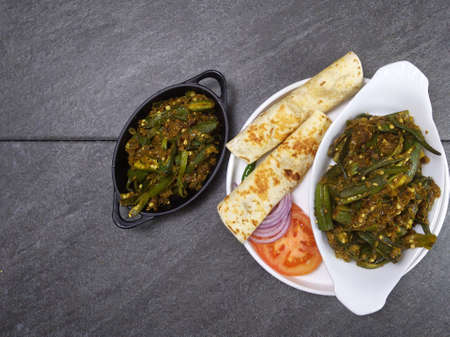 Bhindi Masala or stuffed Bhindi or okra, an Indian vegetable on a plate with copy space.
