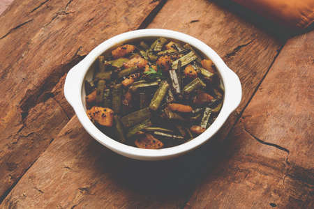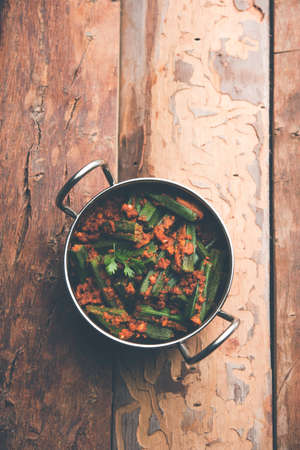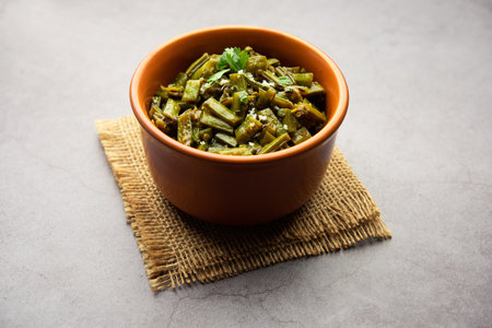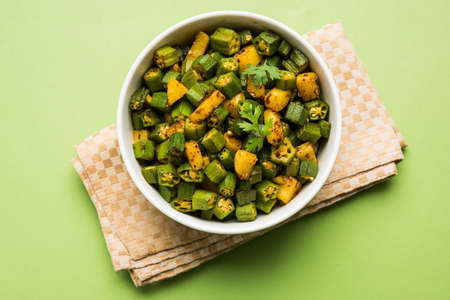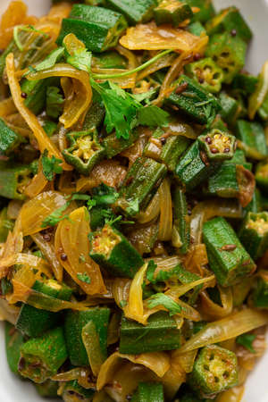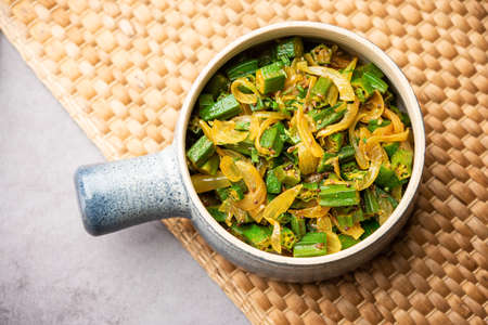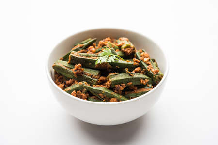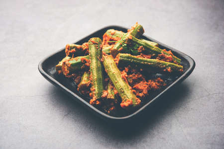 Indian masala fried bhindi or bhendi or Okra or ladyfinger curry or sabji, selective focus