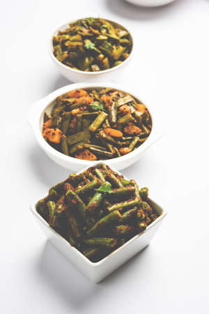 Closeup picture of indian green vegetable masala curry / sabzi / sabji like Green Beans, gowar /cluster beans and bhindi or ladies finger or okra. Served in white ceramic bowl over white background.