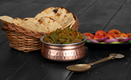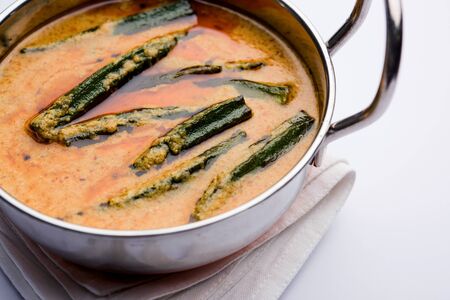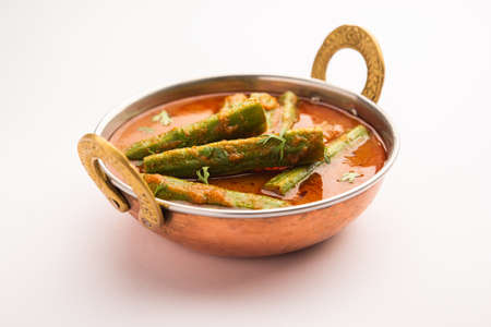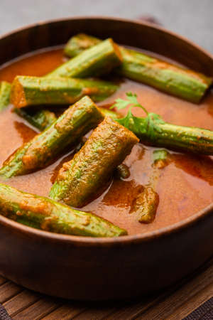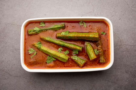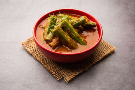 Hyderabadi Bhindi ka Salan or Okra salan made using ladies' fingers or ochro. Main course recipe from India. served in a bowl. selective focus