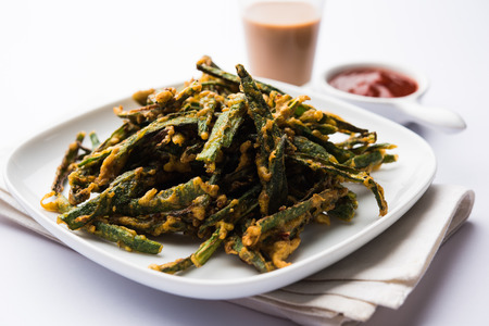 Kurkuri bhindi or crispy ladyfinger or okra fry recipe, served in a bowl with ketchup and hot tea. selective focus