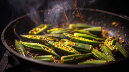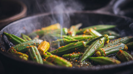 A vibrant scene of fresh okra being cooked in a hot pan, releasing steam and infused with spices. Ideal for dishes that celebrate healthy eating.