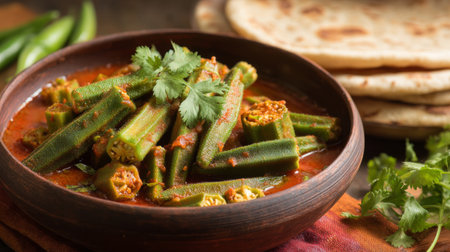 A vibrant okra dish prepared with spices and fresh herbs served in a wooden bowl beside soft flatbread. Ideal for showcasing delicious vegetarian cuisine.