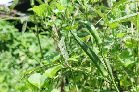 Fresh Lady Fingers, Bhindi, Okra, Abelmoschus, Esculentus, ochro, gumbo vegetable with flowers growing in the farm. Selective focus, India, Mumbai, Maharashtra.