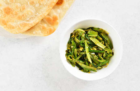 Indian style spring onion stir fry in bowl over white background with copy space. Top view, flat lay