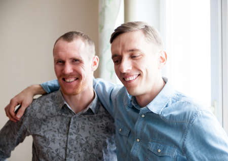 excited gay man holding hands of bearded boyfriend and laughing on gray backdrop, same-sex couple. Happy people celebrate