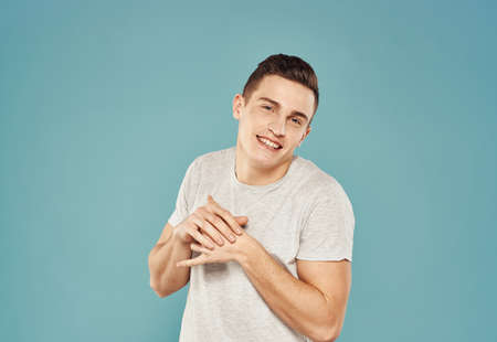emotional man in a white t-shirt stress medicine pain in the neck studio treatment