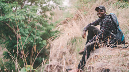 Success african man traveler sitting on the cliff with backpack.16:9 style