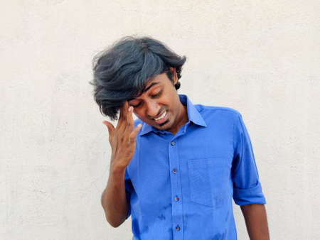 Clean shaved young man touching forehead with hands. Dissatisfied or regret about wrong decision.