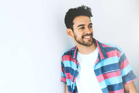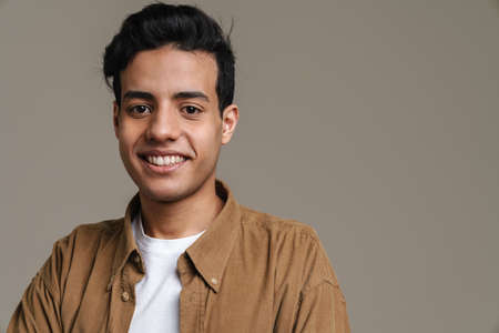 Brunette hispanic man in shirt smiling and looking at camera isolated over grey background