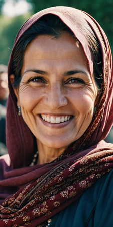 A joyful woman 45 years old from Afghanistan displays a bright smile while wearing traditional clothing. She stands confidently, embodying a sense of peace in her rural community. Generative AI.