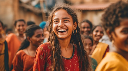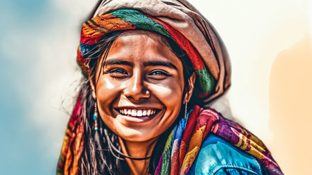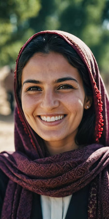 A woman from Afghanistan beams with joy, showcasing her warm smile. Dressed in traditional attire, she represents the vibrant culture of her community, radiating positivity. Generative AI.
