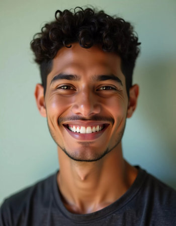 Bright smile radiates joy as a Brazilian man with curly hair poses for a cheerful portrait. The soft background complements his lively expression, capturing a moment of warmth and vibrancy.