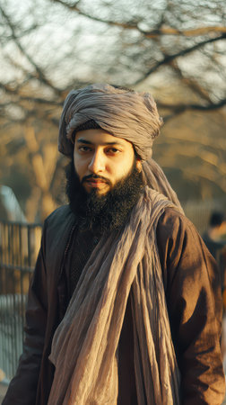 A young man wearing traditional clothing stands confidently outdoors at sunset surrounded by softly blurred trees and people in the background.
