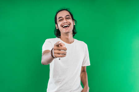 handsome man with long black hair Asian laughing happily while pointing at camera on a green background