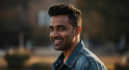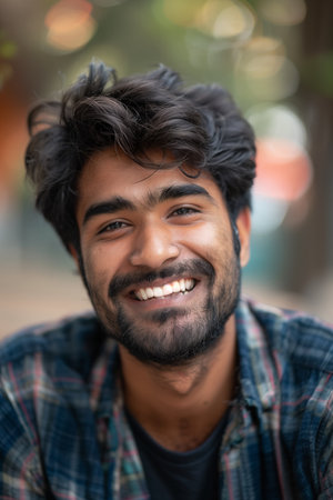 Face smiling portrait of young Indian man student looking at camera city street