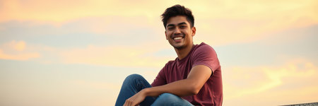 A happy young man with short brown hair sits outdoors during the golden hour