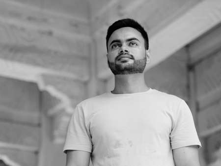 Young handsome bearded Indian man at the park in black and white
