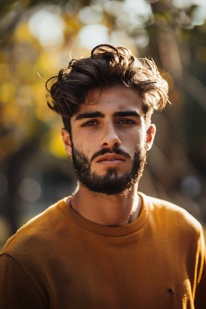 Portrait of a handsome young man with beard in autumn park.