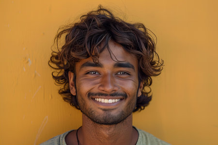 Young indian man smiling against yellow background