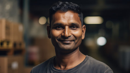 A smiling Indian male factory worker standing in warehouse. Generative AI AIG19.