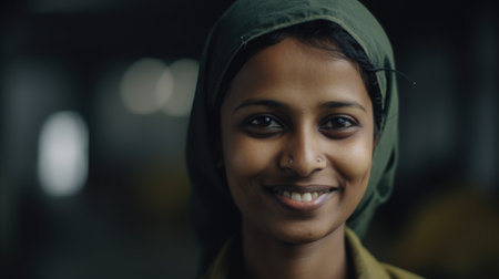 A smiling Indian female factory worker standing in metal sheet factory. Generative AI AIG19.