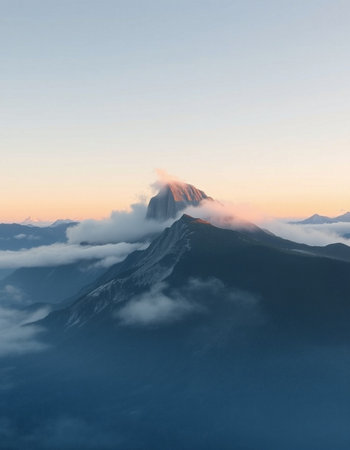 Mountains in the clouds at dawn. View from the top.