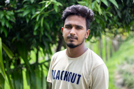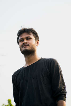 Bangladesh, Rangpur- August 21, 2021. A young man is standing in style wearing a yellow dress and his short beard and his behind background blur