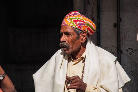 Udaipur, India - Jan 03, 2020: Indian Rajasthani people in national clothes in the streets of Udaipur, Rajasthan