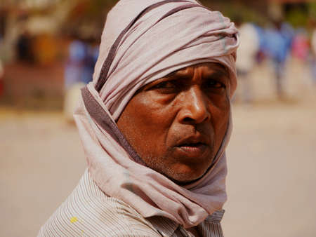 An indian village man looking at camera behind people looking blur background at day time at city Katni Madhya Pradesh in India on March 2022.