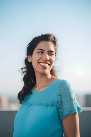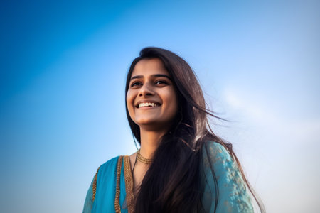 Portrait of a beautiful young indian woman smiling on blue sky background