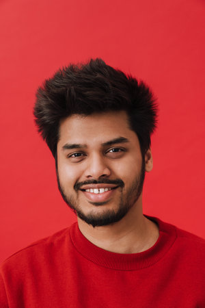 Young brunette indian man smiling while posing at camera isolated over red background