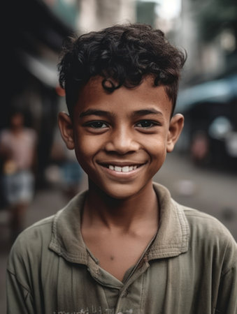 Portrait of a young boy smiling at the camera in the street