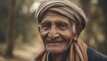An elderly man from Afghanistan showcases his weathered face, reflecting years of wisdom and resilience against a modest backdrop of nature, embodying the rich culture of his homeland. Generative AI.