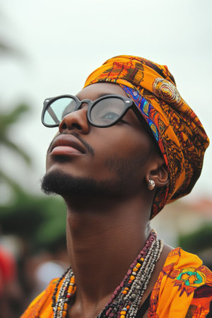 Portrait of a fashionable African man wearing a headscarf, sunglasses, and necklaces, gazing upwards with a contemplative expression