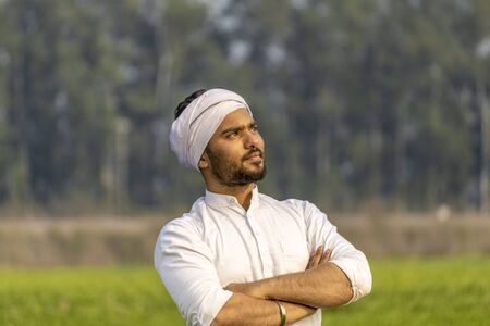 portrait of a farmer standing in field and thinking