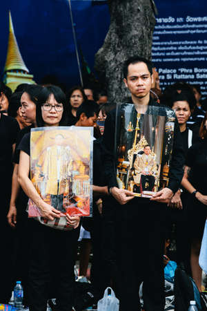 BANGKOK THAILAND - OCTOBER5,2017 : thai mourners people wearing black clothes and carrying king and queen of rama ix bhumibol photograph on last day of respect to their beloved king at grand palace