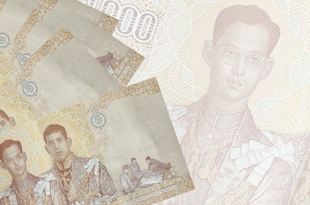 1000 Thai baht bills lies in stack on background of big semi-transparent banknote. Abstract business background with copy space
