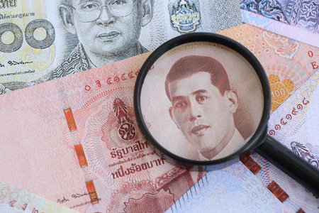 Thai baht currency money bills and magnifying glass close up. The concept of financial monitoring and taxation