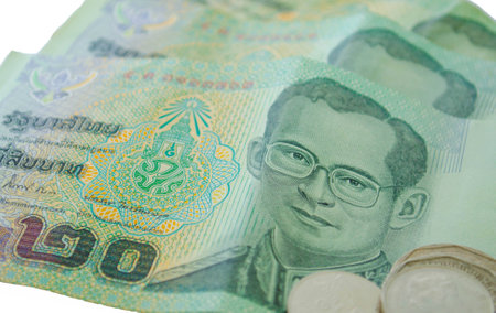 Close up of Thai banknote Thai bath with the image of Thai King. Thai banknote of 20 Thai baht on Green Scottish fabric. Thai currency concepts., Sensitive Focus.