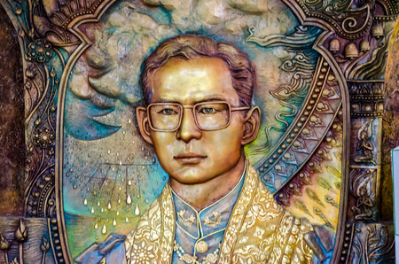 BANGKOK ,THAILAND - 9 JULY 2014 : masterpiece of traditional Thai style sculpture on the wall of church of Wat Rama 9 Kanchana Pisek ,Portrait of Thai King Bhummibol Adulyadej Bangkok Thailand