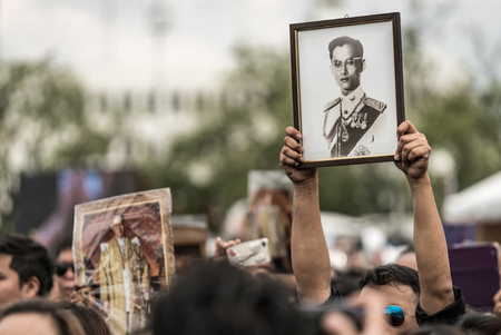 BANGKOK, Thailand - OCT 22: Unidentified people lift His Majesty King Bhumibol Adulyadej photo on October 22,2016 Bangkok, Thailand. Thailand's King, the world's longest-reigning monarch, has died after 70 years as head of state.