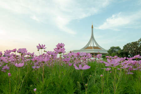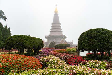 flower garden and stupa in the morning mist, chiang mai, thailand