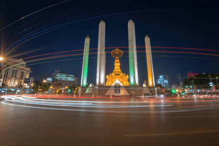 A prominent monument stands tall, bathed in colorful lights, with blurred streaks of car headlights and taillights creating a dynamic urban night scene.