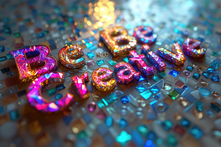 The letter of be creative in variant texture with bright light neon color at shimmer colorful crystal with texture of diamond and gemstone or colorful jewel scatter around with 3D design. Neon. AIG42.