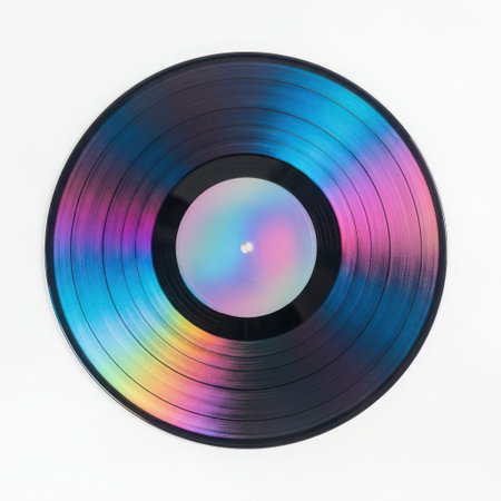 CD surface reflecting neon colors under strong artificial lighting, placed on a minimal background